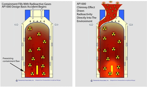 “The proposed AP1000 containment design is inherently less safe than current reactors,” said Arnold Gundersen, former senior vice-president at Nuclear Energy Services PCC who currently heads up Fairewinds Associates consulting firm. Westinghouse did not analyze the scenario for failure containment warned of by Gundersen. He continued, “Westinghouse has ignored the long history of previous containment failures that indicate there is a high likelihood that the AP1000 containment might be in a failed condition [one or more undetected holes] before an accident begins. The containment leakage problem is exacerbated because the AP1000 is specifically intended to function as a chimney – to pull air up and release it through the top of the building.”