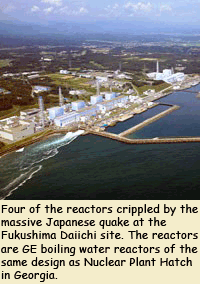At present, six GE boiling water reactors at Fukushima Daiichi (I) built in the 1970s and four GE boiling water reactors at Fukushima Daini (II) built in the 1980s are all shut. (EDITOR'S NOTE 3/12/12: all but one of Japan's reactors are shut) General Electric is the American company who collaborated with Hitachi and Toshiba to build nuclear reactors in Japan. Five of the Fukushima Daiichi reactors that are posing the immediate threat are the same type as Nuclear Plant Hatch on the Altamaha River in Georgia.