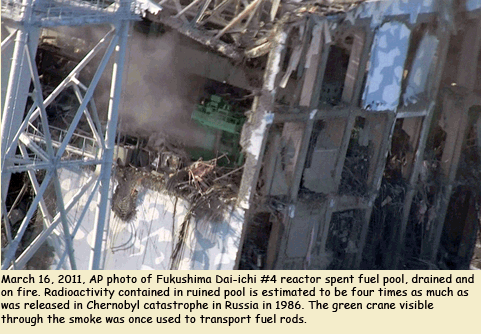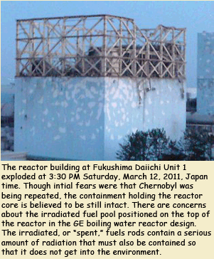 Fukushima Daiichi Unit 3 which loaded PLUTONIUM MOX REACTOR FUEL in September 2010 exploded Monday at 7:00 p.m. local time. Operators are flooding both reactor containments with sea water and boron which captures neutrons, but have been unable thus far to figure out a way to actually introduce coolant into the reactor core. Experts agree that restoring electricity to the water pumps is crucial. Questions also remain unanswered about the condition of the chilling pools containing highly radioactive "spent" fuel rods. A press release from TEPCO (Tokyo Electric Power Company) Sunday acknowledges that they are trying to figure out how to cool the fuel pools. Fuel pool fires or loss of coolant are extremely risky scenarios at reactors and in the GE boiling water reactors are located on top of the reactor building, a design weakness that was corrected in later reactor designs. The highly radioactive spent fuel rods are the class of waste for which deep geologic disposal is required, and as multiple cores are presumed to be stored in each pool, a crisis with the fuel pools could rival or surpass the crisis in the reactors.