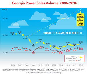 Nuclear Watch South testimony is backed by Georgia Power’s annual report data which show Georgia Power increasing profits even as the company racks up sagging sales and is using less than 60% of its existing capacity.
