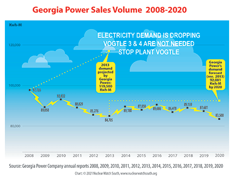 Glenn Carroll, coordinator of Georgia-based environmental organization Nuclear Watch South says, "Georgia Power’s own data show that sales have gone down, not up, for the 11-year period from 2002 to 2013. Georgia Power’s 4% annual growth forecast used to justify constructing two additional reactors at Vogtle has not materialized. Georgia Power is 45% overbuilt and in a protracted sales slump.