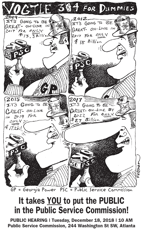 “The PSC is the only forum for Georgians to confront the rich and powerful Georgia Power monopoly,” Ms. Carroll observes. “A couple of times a year, ordinary citizens have an opportunity to address the PSC and Georgia Power about the breathtakingly expensive Vogtle 3 & 4 project. Now Georgia Power is effectively ducking confrontation with its captive public over the $18 billion boondoggle it has foisted upon us.”