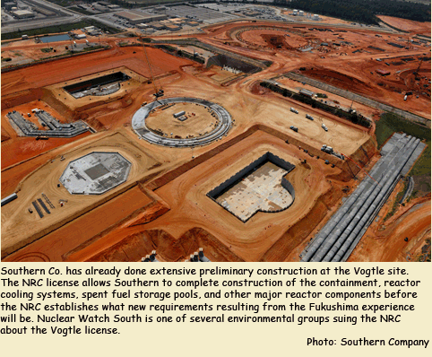 "It is terribly irresponsible of the NRC to rush this risky reactor project through even as Japan continues to grapple with the unstable condition of the wrecked Fukushima reactors," says Nuclear Watch South Coordinator Glenn Carroll. "There are many concerns with nuclear energy even beyond those raised by the Fukushima catastrophe. We hold out hope that Southern Company and Georgia Power may yet come to their senses to recognize the tangible successes of wind and solar power and decide to abandon dead-end, out-moded nuclear power.