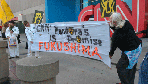 11/7/13 ATLANTA: CNN decided to air controversial pro-nuclear film "Pandora's Promise" and found itself at the center of national controversy. A petition with 30,000 signatures got CNN's attention which then scheduled some debates with Sierra Club executive director Michael Brune and Beyond Nuclear Campaigner Kevin Kamps. "Atomic States of America" was aired for free all week on vimeo. And here in Atlanta, Nuclear Watch South figured we should get ourselves downtown to CNN Headquarters for some good old-fashioned street heat! We were well received by the tourists, businessmen and concert goers. Betsy Rivard eluded security for this one photo before we were chased away from the CNN sign!