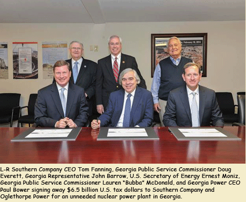 WAYNESBORO 2/20/14: U.S. Secretary of Energy Ernest Moniz came down to Georgia to sign off on giving 6.5 billion in taxpayer dollars to Southern Company, its subsidiary Georgia Power, and Oglethorpe Power to build two nuclear reactors at Plant Vogtle near Augusta.