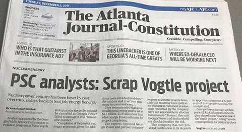 ATLANTA 12/6/17: Public interest groups and private citizens will converge on the Georgia Public Service Commission in December to confront Georgia Power about its Vogtle 3 & 4 construction fiasco at the 17th Semi-Annual Vogtle Construction Monitoring Review (VCMR). These reviews have occurred roughly every six months since construction commenced on Vogtle 3 & 4 reactors in Burke County in 2010, but this is the first time that Commissioners have officially asked the question whether to cancel the troubled project which is at least five years behind schedule and has doubled in price to $25 billion. The only other reactors under construction in the U.S. were cancelled by South Carolina utilities on July 31, 2017, following the bankruptcy of Westinghouse in March.