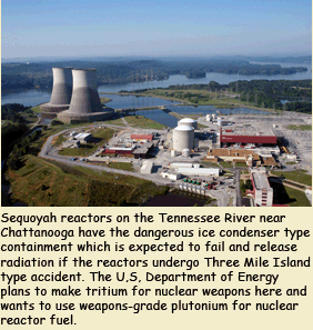 Now DOE has fixed its sights on Sequoyah again as a potential MOX plutonium fuel reactor. A MOX test fuel assembly failed in Duke Power ice condensers near Charlotte and Duke declined to renew its involvement in the MOX program. Now the DOE is desperate for reactors to perform the necessary irradiation services which is how the plutonium is supposed to get so radioactive it cannot be stolen and used in nuclear weapons. DOE is courting TVA to enlist Sequoyah and the GE Fukushima-design reactors at Browns Ferry in the MOX plutonium project which would mean 10 years of licensing and testing in these rickety old reactors.