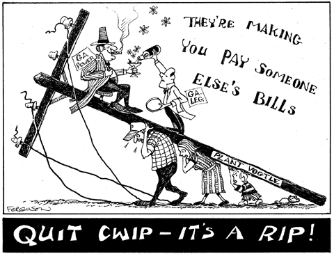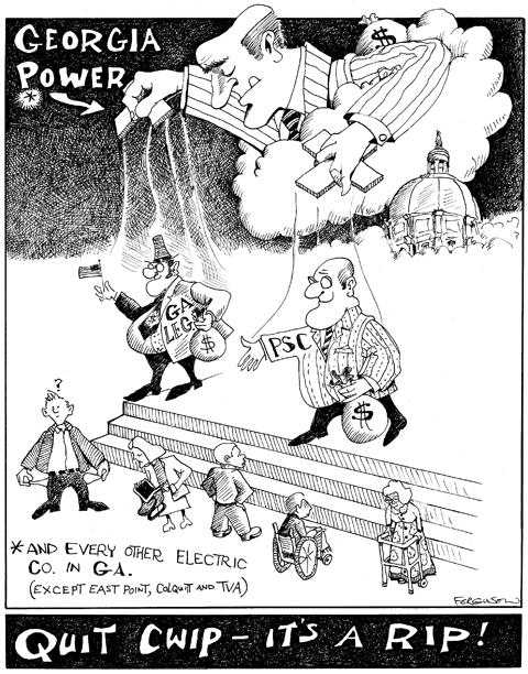CWIP is a rip-off game from beginning to end, because the Public Service Commissioners rubberstamp the financial schemes of monopolistic Georgia Power instead of protecting the interests of Georgia ratepayers. So far the PSC has approved several rate hikes with many more in our future. Under the corporate CWIP nuclear tax, utility customers will continue to pay periodic rate increases to pay interest to bondholders and returns to shareholders on capital invested in nuclear power plants. When citizens complain about this unfair tax to the PSC, they say ìit’s not our fault, take it to the legislature — they are the ones that passed the law.